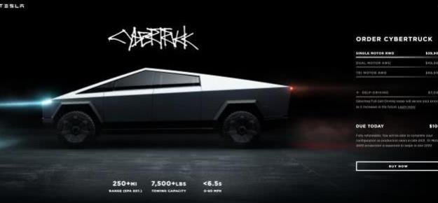 價(jià)格上,Cybertruck3.99萬美元起售,***高售價(jià)6.99萬美元,擁有250英里、300英里、500英里三種續(xù)航版本,其中250英里版本是RWD版本(后置驅(qū)動(dòng)),而另外兩個(gè)版本是AWD(全輪驅(qū)動(dòng))版本。Cybertruck現(xiàn)在就可以接受預(yù)訂,將在2021年底完成對生產(chǎn)線的配置,2022年正式投產(chǎn)。